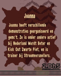 Joanna heeft verschillende demonstraties georganiseerd en gemc’t. Ze is onder andere actief bij Nederland Wordt Beter en Kick Out Zwarte Piet, en is trainer bij Stroomversnellers.