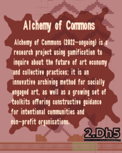 Alchemy of Commons (2022-ongoing) is a research project using gamification to inquire about the future of art economy and collective practices; it is an innovative archiving method for socially engaged art, as well as a growing set of toolkits offering constructive guidance for intentional communities and non-profit organisations. Yin Aiwen, the core developer of the project, is an artist, designer, researcher, educator and occasional institutional strategist based in London and Rotterdam. She advocates relationship-focused design as a strategy to redesign, re-engineer and reimagine the relationship between technology and society.